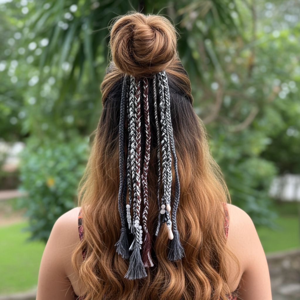 Introducing our stunning Hairties, handmade with love! Adorned with seashells, ghungroos, mirrors, and more, these unique pieces perfectly complement any Indian outfit.