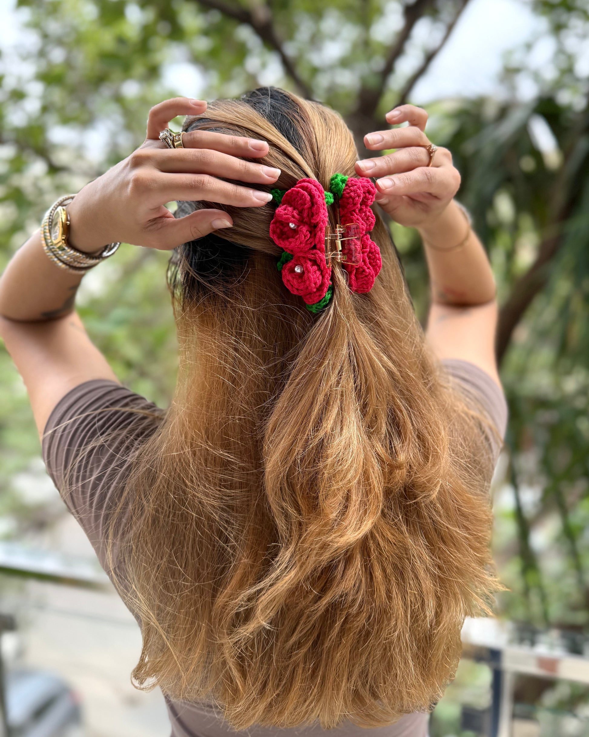 Elevate your style with our crochet hair claw! Perfect for day or night, this accessory adds a touch of elegance to any outfit.