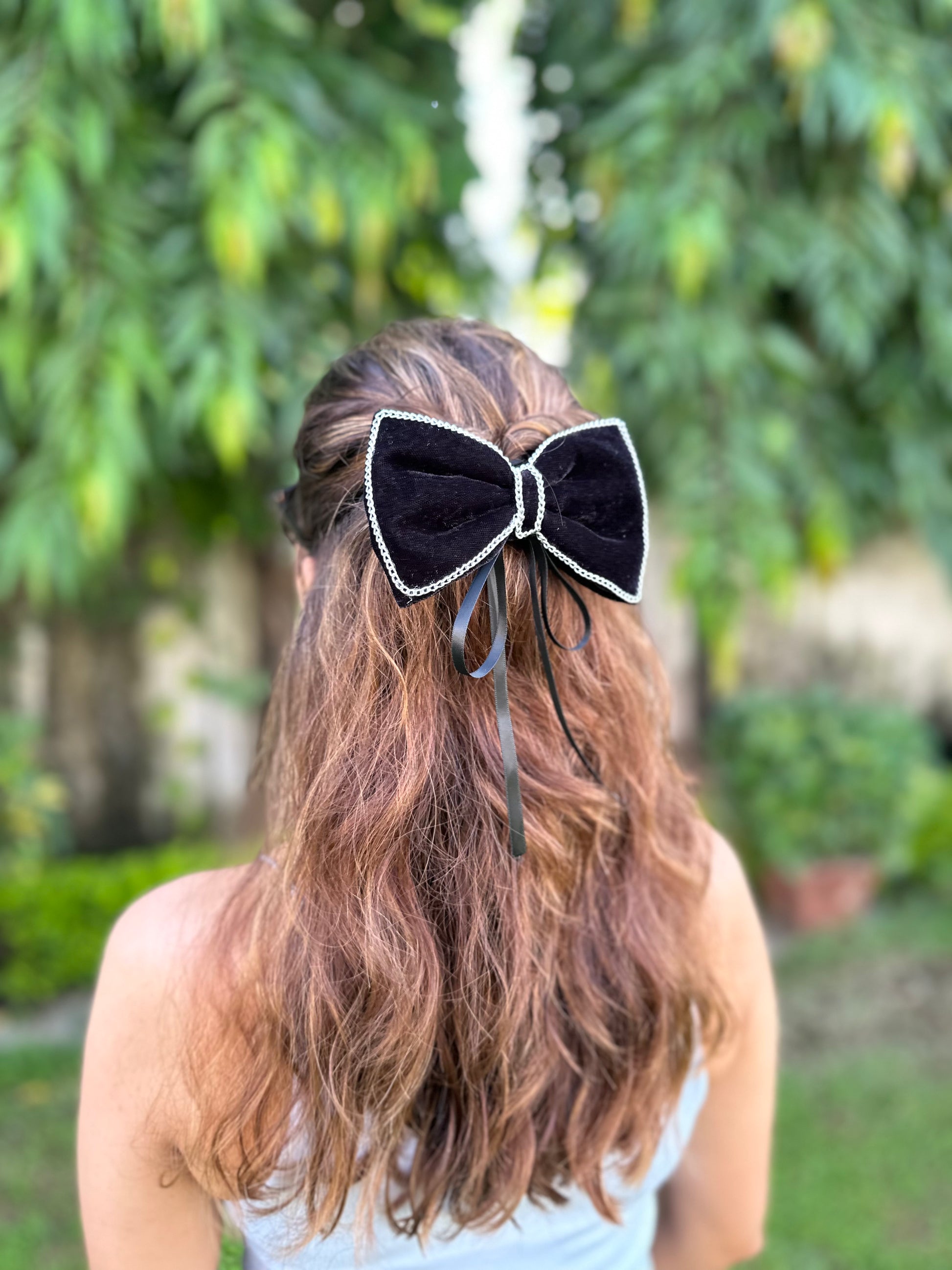 Fabric hand-knotted into an oversized bow. Adds a finess to just about any hairstyle.
