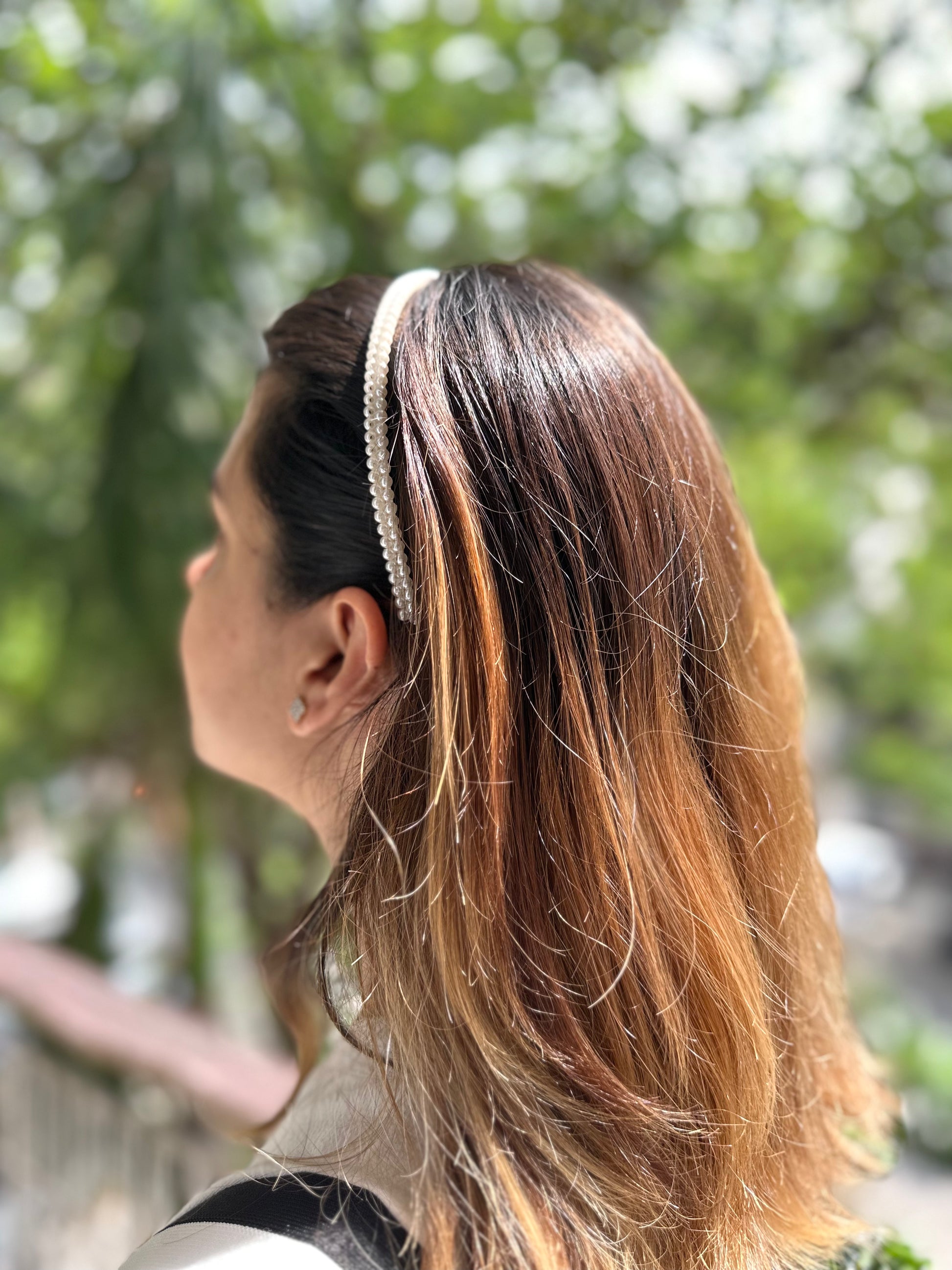 White pearl beaded all over the comfort fit headband. Can be worn as a hairband, or a simple ponytail.